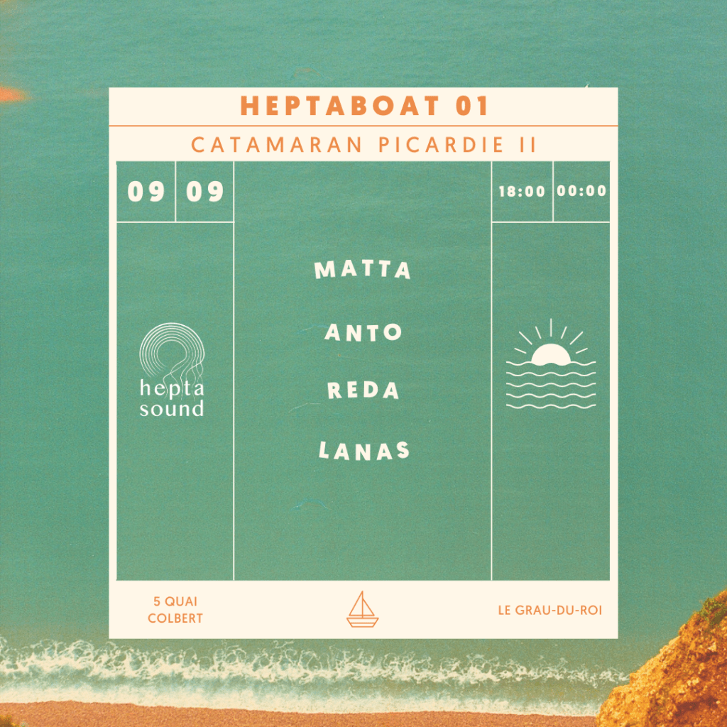 On en remet une couche pour fêter l’arrivée des beaux jours : RDV le 28 juin prochain pour HEPTABOAT #2 🛥️🪼 sur le Catamaran Picardie II de 18h à 22h pour une croisière musicale 🪩🕺 Au programme : du son, de quoi régaler vos papilles , des cocktails et bien sur un magnifique coucher de soleil sur la méditerranée 🌅 Places limitées, réserve ta place !